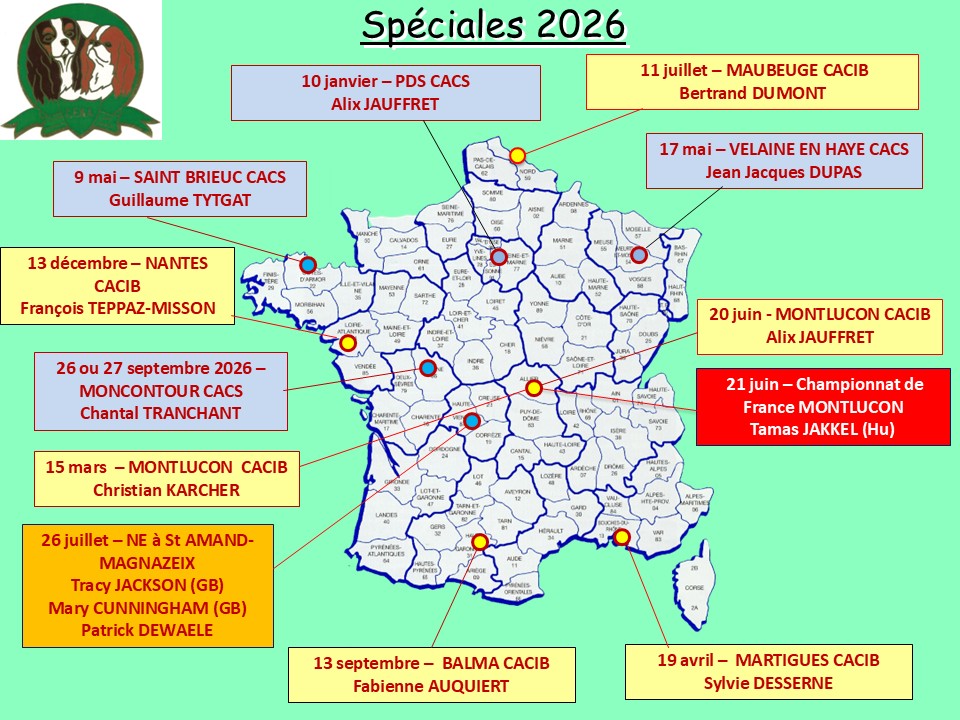 ATTENTION: Pour les expositions qui se déroulent sur 2 ou 3 jours, vous devez vérifier par vous-même quel est le jour de la spéciale des Epagneuls Nains Anglais