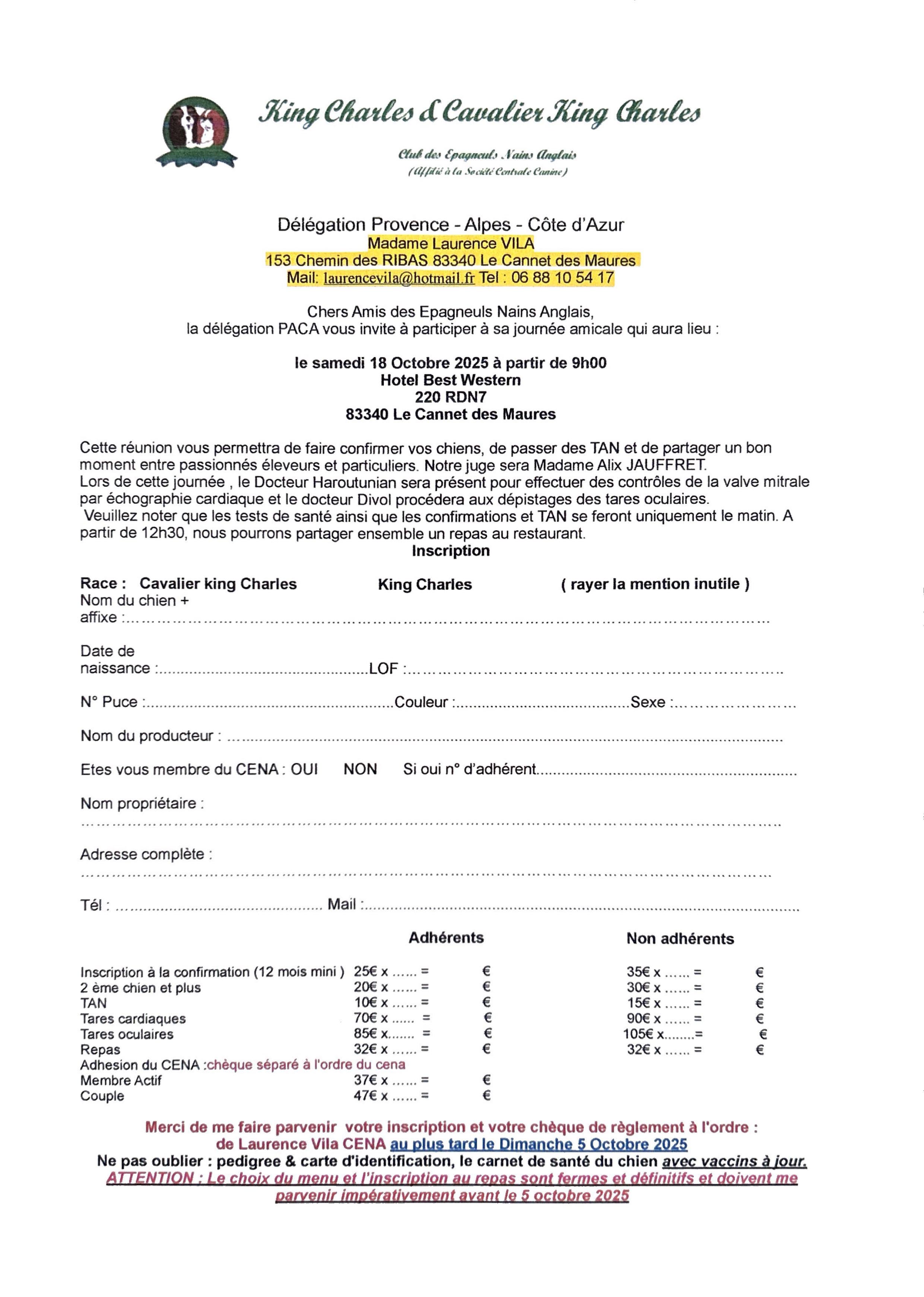 Futures réunions de délégationLa réunion Provence-Côte d'Azur le 18 octobre 2025La Délégation Provence-Alpes-Côte d"Azur du CENA organise sa réunion amicale annuelle le samedi 18 octobre 2025 Résidence Esterazur, Chemin de Portal, Quartier la Grande Bastide, Le Cannet des Maures (83340). Cette journée vous permettra de faire confirmer vos chiens, de passer des TAN et de partager un bon moment entre passionnés éleveurs et particuliers. Les tests de santé, les confirmations et les TAN se feront uniquement le matin, à partir de 9h30 jusqu'à 12h30. Ils seront suivis du déjeuner à partager ensemble au restaurant, un menu unique sera servi, le restaurant proposant des plats de substitution en cas de besoin. Notre juge sera Alix JAUFFRET. Par ailleurs: - le Dr Vétérinaire Gérard HAROUTUNIAN effectuera des échocardiographies. - le Dr Vétérinaire DIVOL effectuera des examens de dépistage des tares oculaires. Ne pas oublier : Pedigree ou Certificat de Naissance, carte d'identification, carnet de santé avec vaccins à jour. ![]() Laurence VILA 153, chemin des Ribas 83340 LE CANNET DES MAURES Tél: 06 88 10 54 17 Cet adresse mail est protégé contre les spambots. Vous avez d'activer le javascript pour la visualiser. |